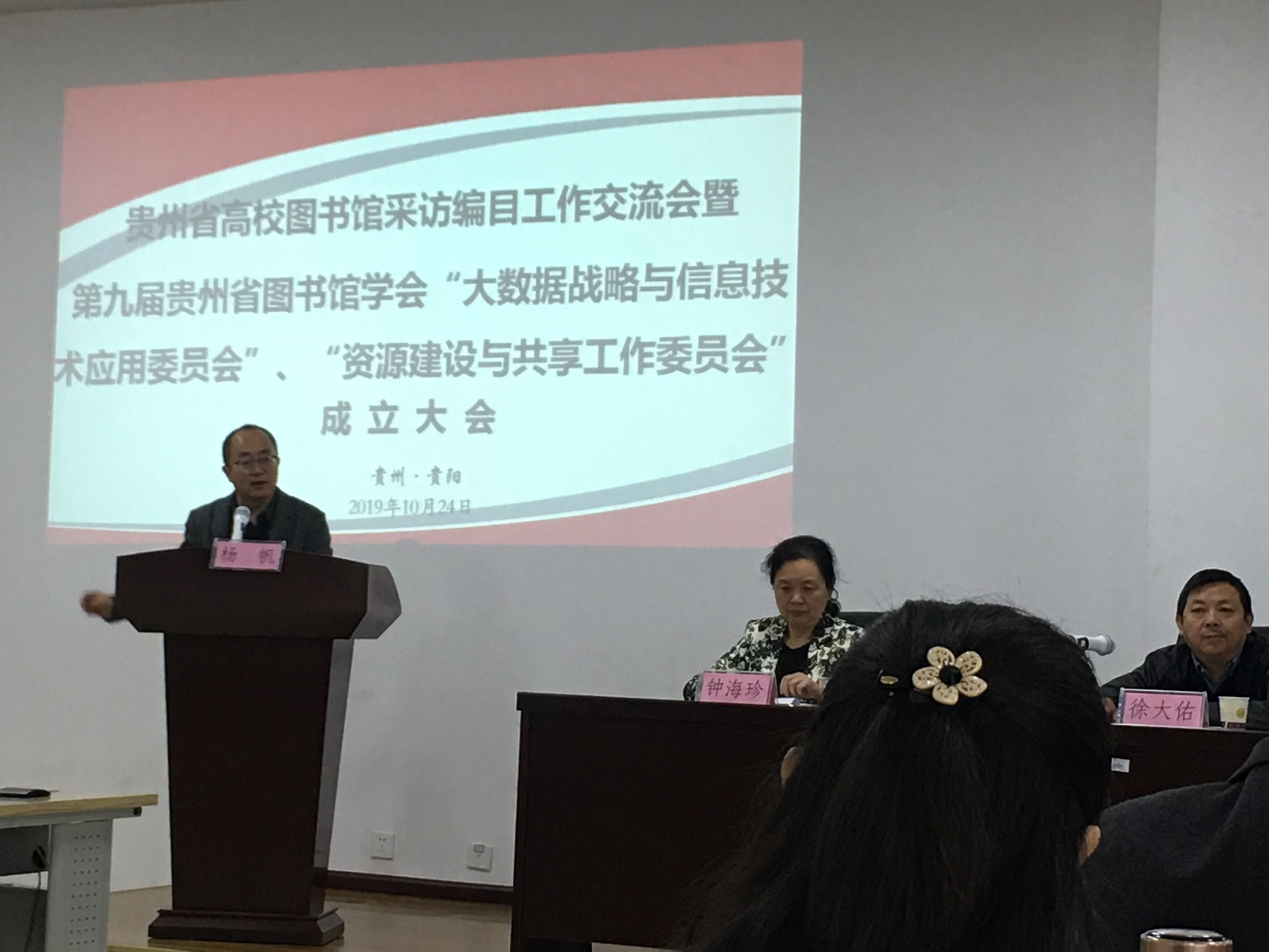2019年10月24日图书馆采编部主任赖春花及馆员米莎,前往贵州财经大学花溪校区图书馆参加由贵州省高等学校图书馆工作指导委员会举办的2019年贵州高校图书馆采访编目工作交流会暨第九届贵州省图书馆学会“大数据战略与信息技术应用委员会”、“资源建设与共享工作委员会”成立会议。