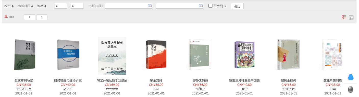 1.1、平台可按图书的出版时间、定价排序。也可按价格区间、出版时间段、重点图书【即图书馆关注的重点出版社】进行筛选。