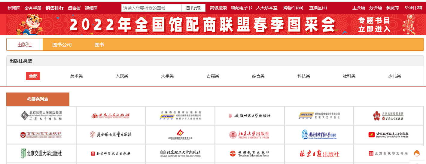 1、主会场:其右上角展示图采会开幕式领导讲话及平台消息发布。其他板块主要展示重点出版社书目,直接点击出版社名称即可进入选书界面。