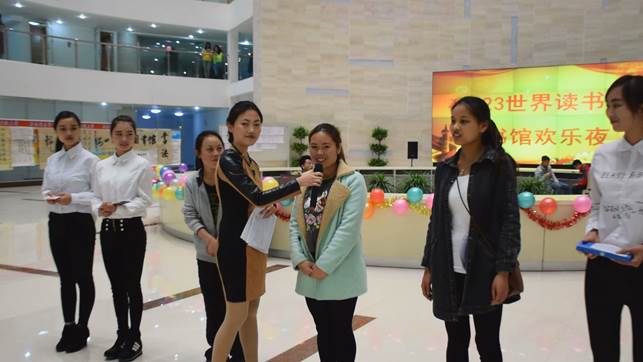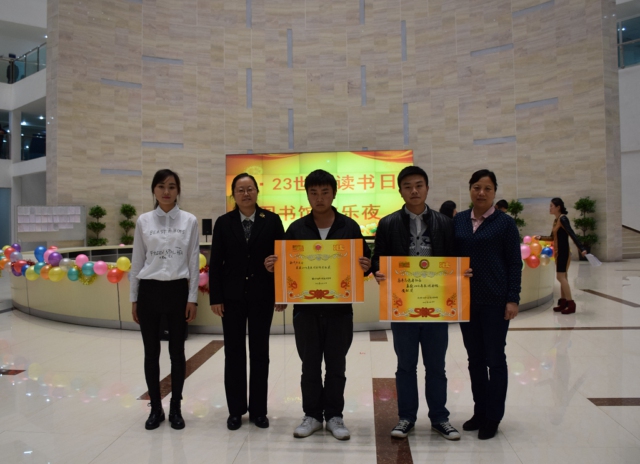 4月23日晚7点,图书馆一楼大厅灯火辉煌,场面热烈,副校长李勤,图书馆馆长郭云莹、团委王永峰等老师参加了“读书节欢乐夜”的颁奖典礼。典礼上,大家共同分享了在图书馆系列活动中获奖者的成功与喜悦,欣赏了由街舞社、中职校、动漫社带来的精彩节目,目睹了书海寻宝、猜谜语、背诵古诗跳绳紧张而激烈的角逐。