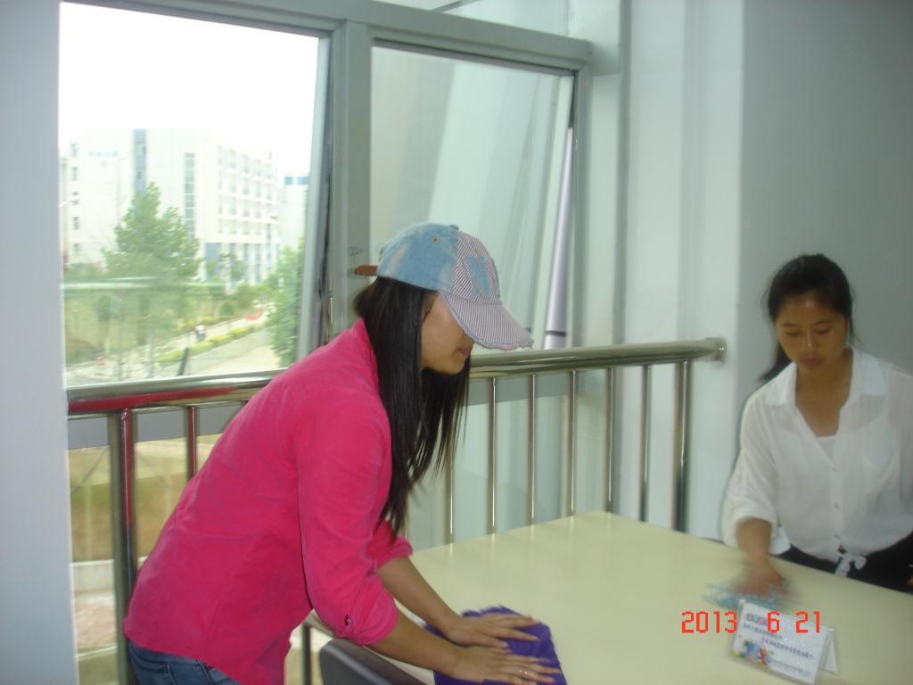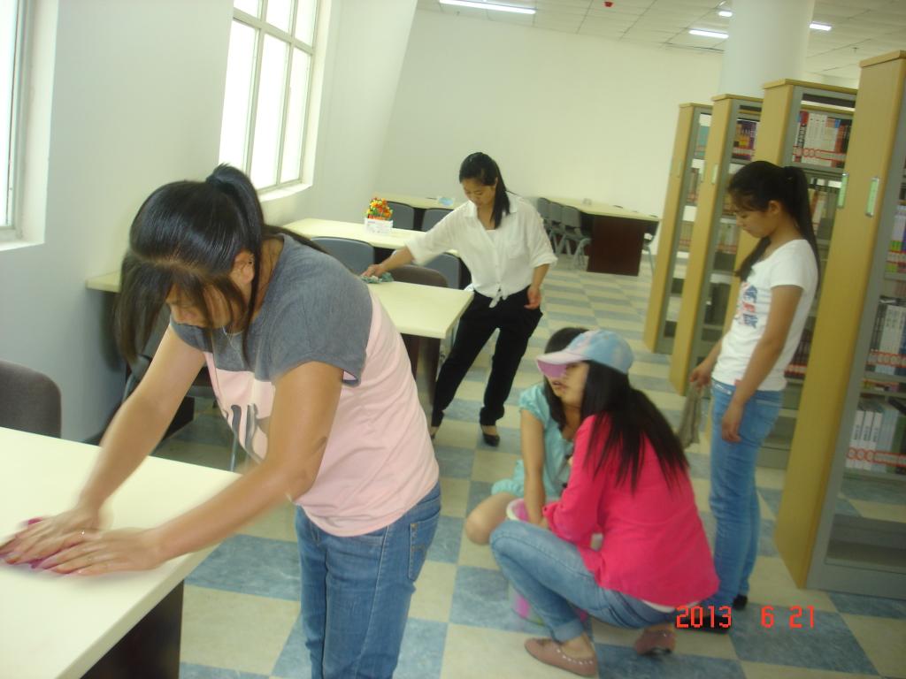 在图书馆工作人员的组织带领下,同学们洗净拧干抹布、拖把,将书库、阅览室卫生进行了一次认真彻底地打扫,为师生在图书馆借阅图书和学习交流创造了清洁、舒适优美的环境,为校园文化生活增添了靓丽宜人的景色。