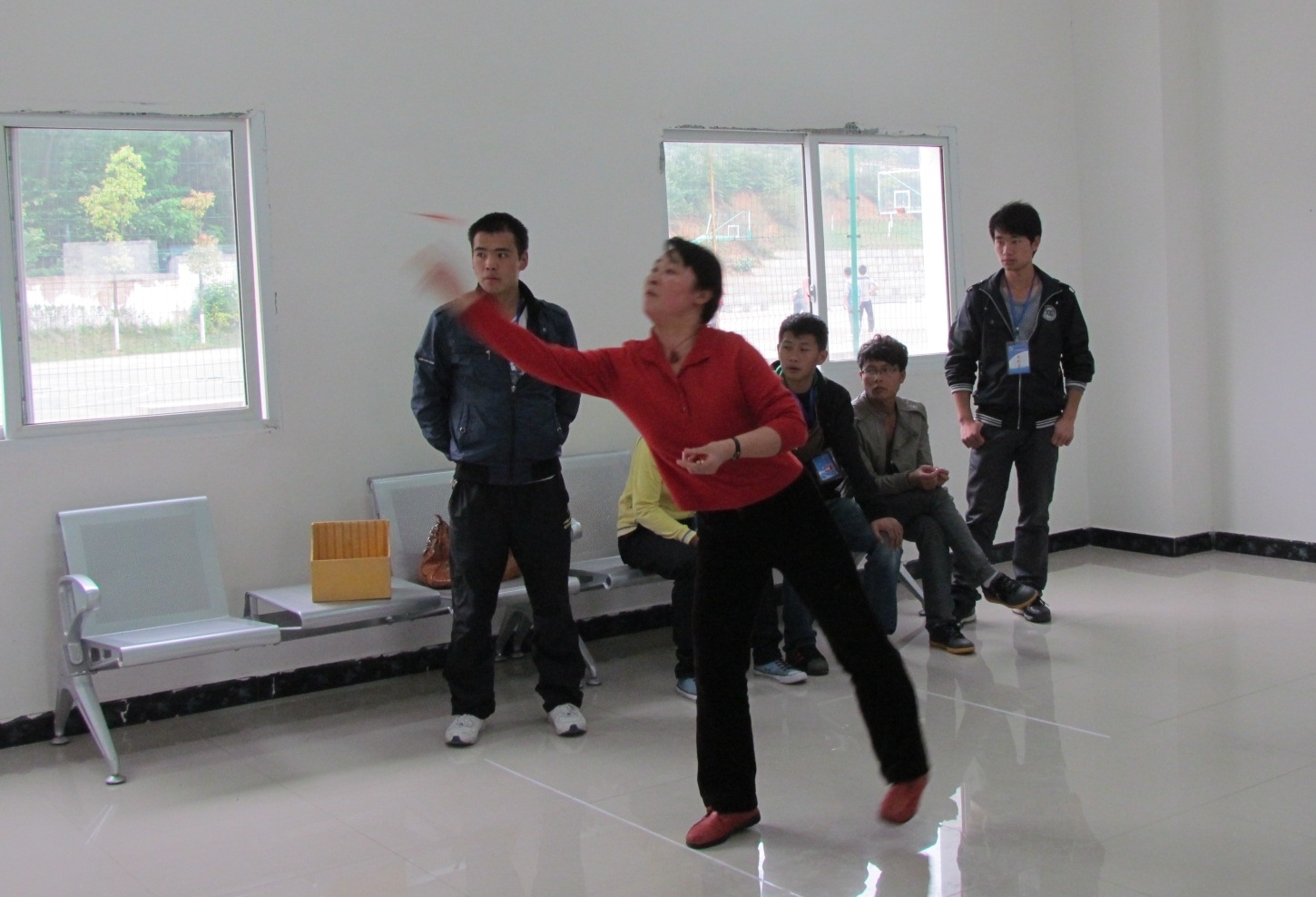 ▲图书馆采编部主任谢颖参加教工乙组投飞镖比赛